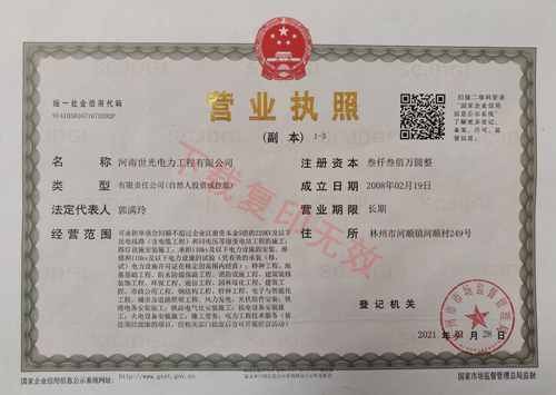 河南世光電力工程有限公司于2008年組建成立,公司注冊(cè)資金叁仟叁佰萬(wàn)元,獨(dú)立核算,自負(fù)盈虧。公司技術(shù)力量雄厚,施工機(jī)具先進(jìn),管理制度完善,保障措施得力。是具有獨(dú)立法人資格的專(zhuān)業(yè)企業(yè)。